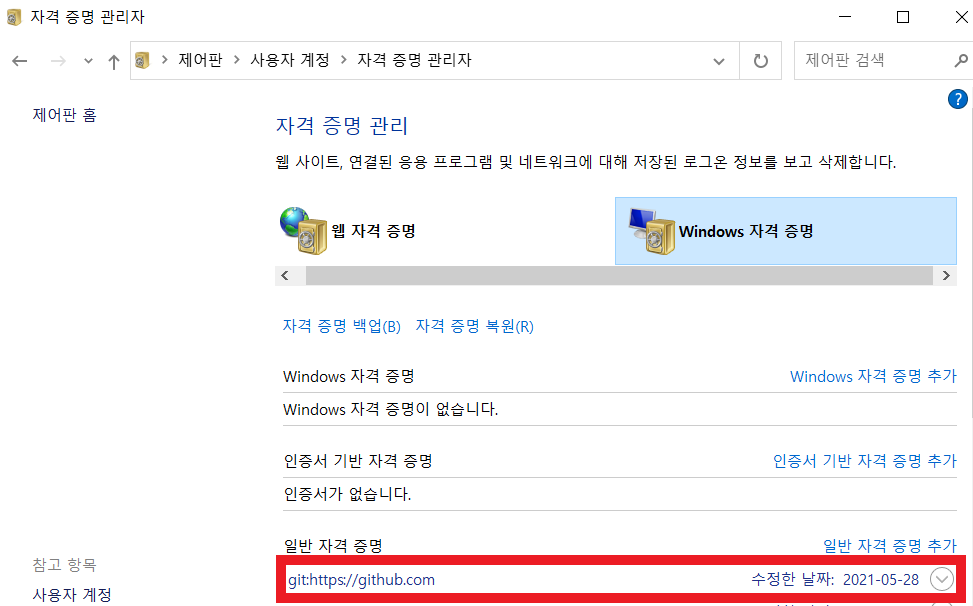 [제어판]-[사용자 계정]-[자격 증명 관리자]-[Windows 자격 증명]